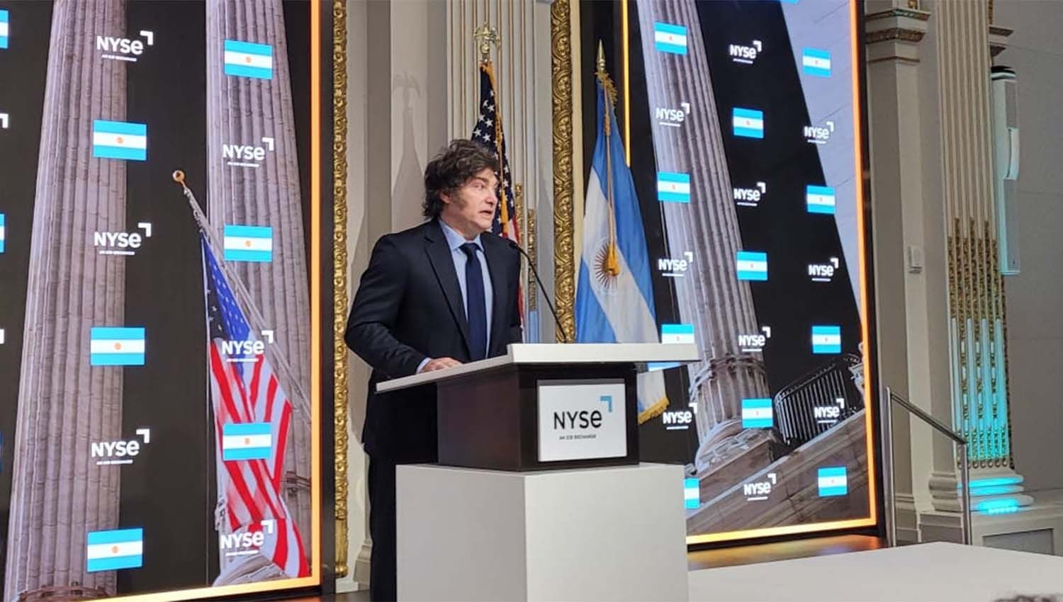 La llegada de Milei generó expectativa porque es una visita institucional. Por eso, por ejemplo, se colocó la bandera argentina en a puerta del emblemático edificio de Wall Street. Al cerrar su discurso, Milei se fue del protocolo y repitió su grito de guerra: "Viva la libertad carajo", espetó.
