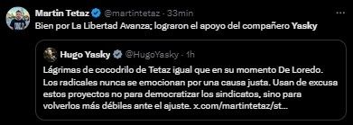 Fue en ese sentido que Yasky salió a responderle: "Lágrimas de cocodrilo de Tetaz igual que en su momento De Loredo. Los radicales nunca se emocionan por una causa justa".