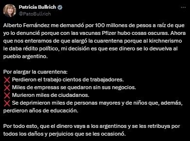 "Por todo esto, que el dinero vaya a los argentinos y se les retribuya por todos los daños y perjuicios que se les ocasionó", concluyó Bullrich la publicación.