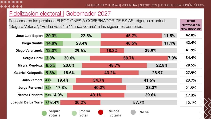 Espert, que ya fue candidato a gobernador en 2023, es quien más intención de voto recogió ya que el 20,3% "seguro lo votaría". Le sigue Diego Santilli -también aspirante al cargo en la interna de Juntos por el Cambio del año pasado- con un caudal de votos asegurado que representa el 14%. En tercer lugar figura Diego Valenzuela cono 12,3%., aunque con 39,9% de desconocimiento.