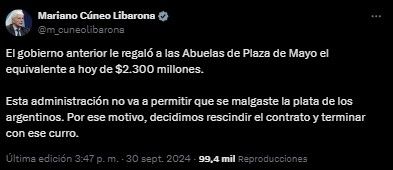 "El Gobierno anterior le regaló a las Abuelas de Plaza de Mayo el equivalente a hoy de $2.300 millones. Esta administración no va a permitir que se malgaste la plata de los argentinos", escribió en el posteo. "Por ese motivo, decidimos rescindir el contrato y terminar con ese curro", concluyó Libarona.