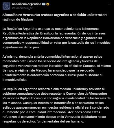 En ese sentido, la cartera a cargo de Diana Mondino advirtió al gobierno venezolano que debe respetar la Convención de Viena sobre Relaciones Diplomática.