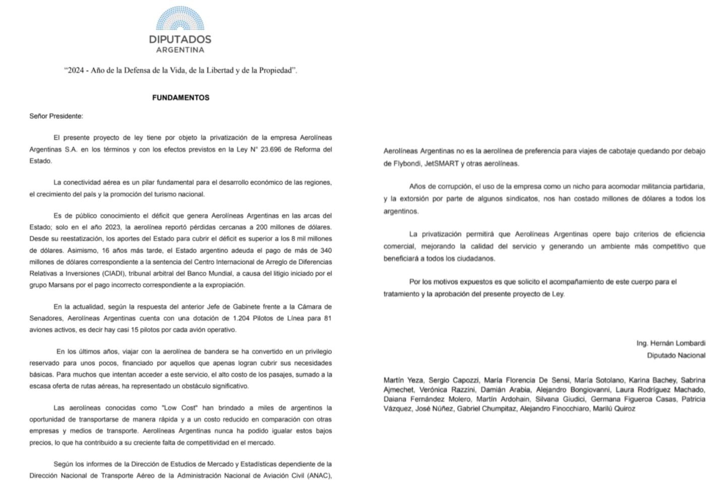 En ese sentido, propusieron que su pase al control privado sea "en los términos y con los efectos previstos en la Ley N° 23.696 de Reforma del Estado". Se trata de una norma sancionada en 1989, durante la presidencia de Carlos Menem, y que permitió el avance de privatizaciones de compañías estatales durante el menemismo.