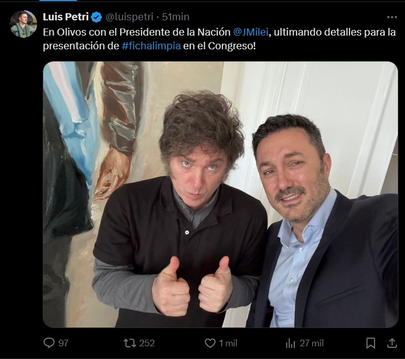 "En Olivos con el Presidente de la Nación, Javier Milei, ultimando detalles para la presentación de Ficha Limpia en el Congreso", posteó el ministro de Defensa, Luis Petri, acompañado de una selfie junto al mandatario desde la quinta presidencial.