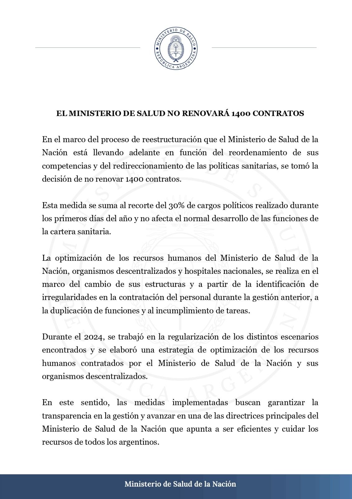 "Esta medida se suma al recorte del 30% de cargos políticos realizado durante los primeros días del año y no afecta el normal desarrollo de las funciones de la cartera sanitaria. La optimización de los recursos humanos del Ministerio de Salud de la Nación, organismos descentralizados y hospitales nacionales, se realiza en el marco del cambio de sus estructuras y a partir de la identificación de irregularidades en la contratación del personal durante la gestión anterior, a la duplicación de funciones y al incumplimiento de tareas", añade.