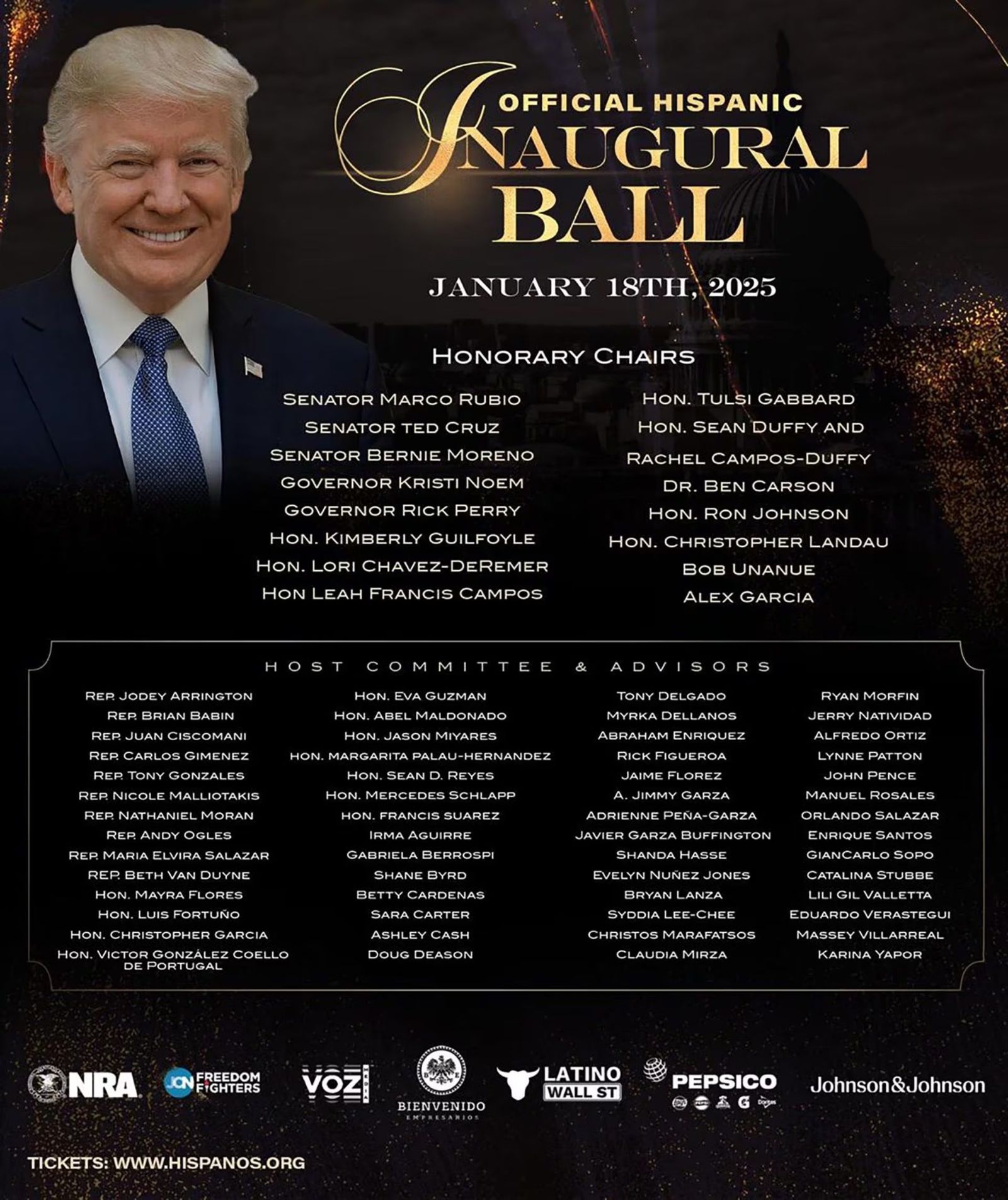 Se trata de una cena y un baile organizados por la agrupación Hispanos, que representa a la comunidad latina trumpista en Estados Unidos, la cual jugó un rol importante en la victoria del empresario en las últimas elecciones. La celebración será el sábado 18 de enero en el hotel Omni de Washington.
