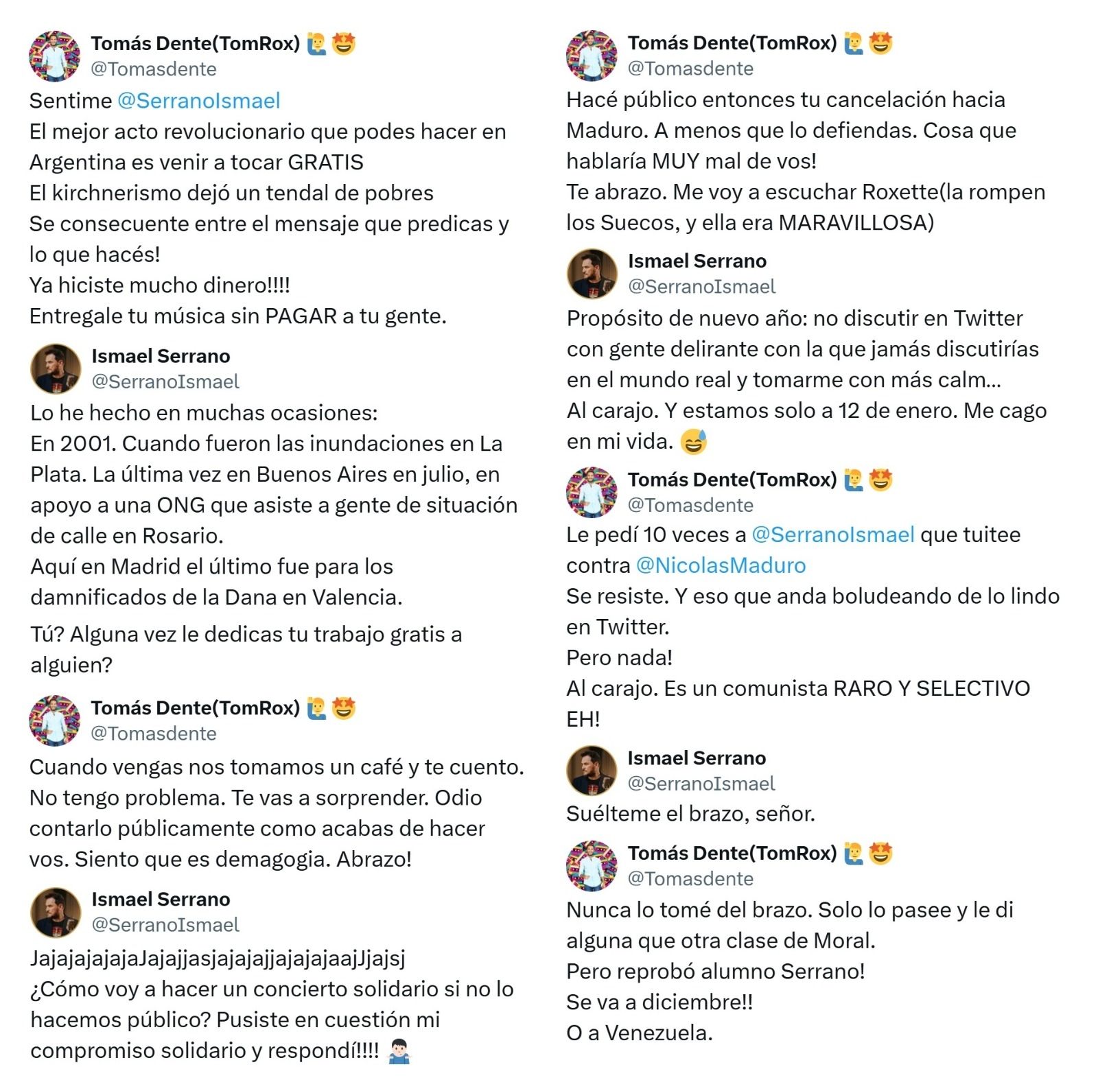 "Tu EGO!!! Tu EGO!!!!! Podes aceptar que a alguien no le guste lo que hacés? Seguimos esperando tu tweet contra @NicolasMaduro. Demostranos vos que no tenes un pensamiento SECTARIO, ni solidaridad "selectiva"... QUEREMOS leerte condenando a un TIRANO DE VERDAD. Vos podes!!!!", le exigió Dente. "Sentime @SerranoIsmael El mejor acto revolucionario que podes hacer en Argentina es venir a tocar GRATIS. El kirchnerismo dejó un tendal de pobres Se consecuente entre el mensaje que predicas y lo que hacés! Ya hiciste mucho dinero!!!! Entregale tu música sin PAGAR a tu gente", insistió.