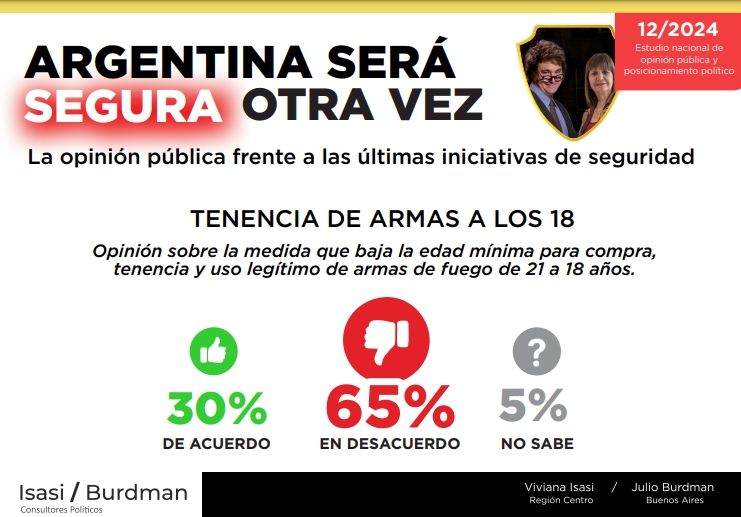 No obstante, la medida que baja la edad mínima para compra, tenencia y uso legítimo de armas de fuego de 21 a 18 años no fue tan bien recibida entre los encuestados. El informe muestra un desacuerdo del 65%, frente a un 30% de agrado y un 5% de indecisión.