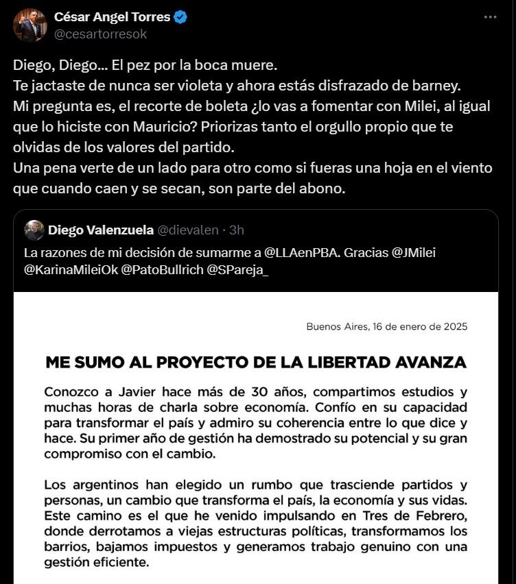 Por su parte, César Ángel Torres, secretario de Gobierno porteño y Vínculo Ciudadano, posteó: “Diego, Diego... El pez por la boca muere. Te jactaste de nunca ser violeta y ahora estás disfrazado de Barney”.