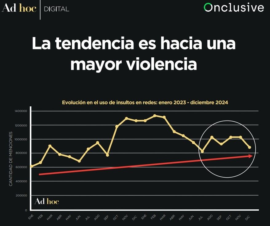 Si de momento se observa una pequeña caída de esta tendencia, la conversación se mantiene en niveles de mayor violencia verbal entre los usuarios argentinos. Desde enero del 2023 hasta diciembre del 2024, se registraron 23 millones de insultos, de los cuales 5 millones surgieron entre julio y noviembre del 2023, en plena carrera electoral. El pico de ofensas, aún así, se evidenció entre octubre del 2023 y abril del 2024.