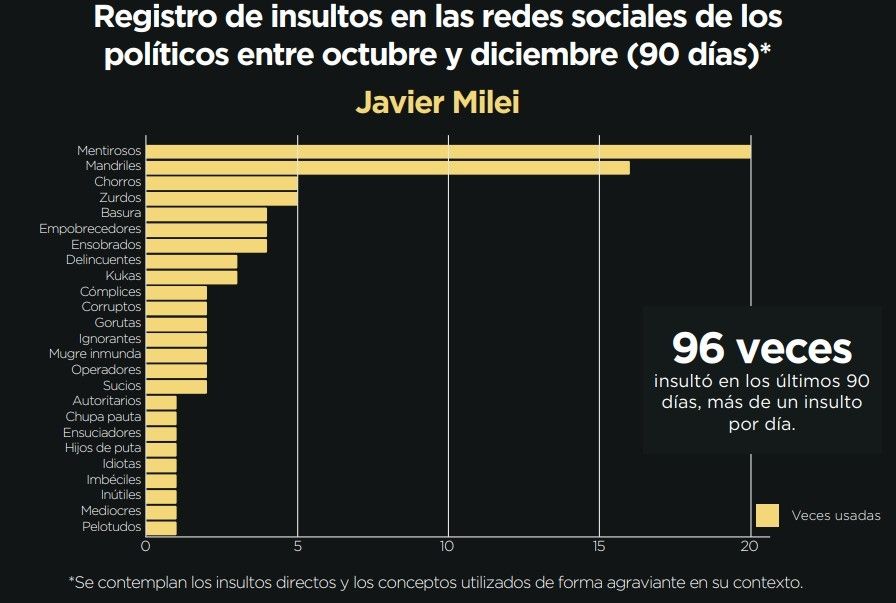 El informe apunta a que el discurso de Milei alimenta esta tendencia. Entre los que más envía el presidente, están: mentirosos, mandriles, chorros, zurdos, basura, empobrecedores, ensobrados, delincuentes y kukas. En los últimos 90 días lanzó, al menos, un insulto por día; y totalizó en ese lapso 96 ofensas.