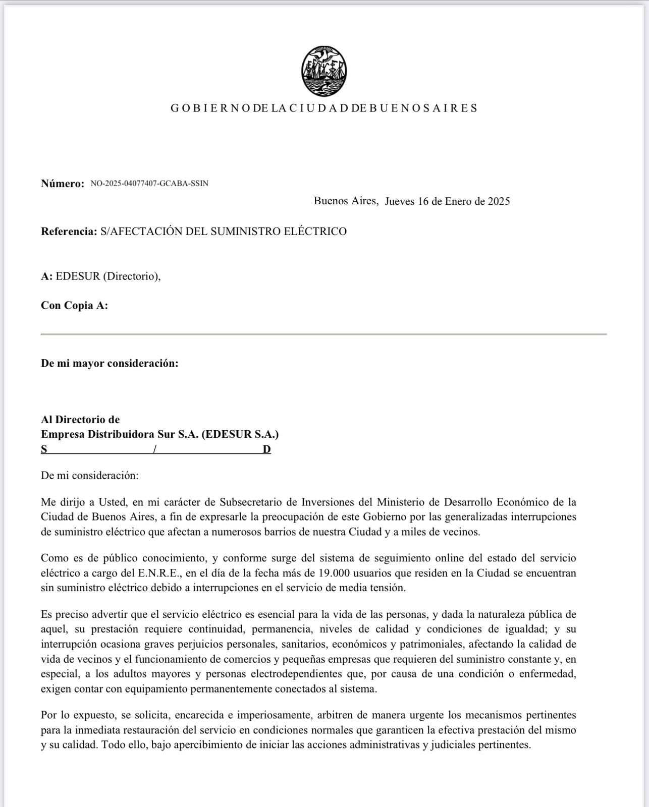 La vocera del Gobierno porteño también compartió una carta que le envió el subsecretario de Inversiones del Ministerio de Desarrollo Económico de la Ciudad de Buenos Aires, Nicolás Zaballa, a Edesur y al ENRE para reclamar por los aproximadamente 19.000 usuarios porteños que todavía seguían sin suministro eléctrico al momento de redactarse el texto "debido a interrupciones en el servicio de media tensión".