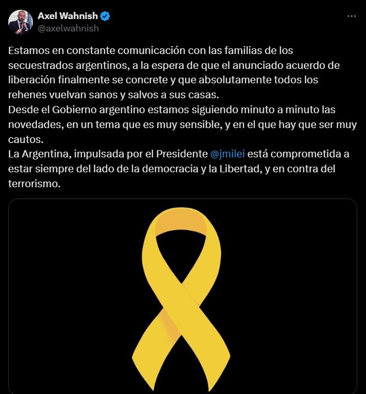"Estamos a la espera de que absolutamente todos los rehenes vuelvan sanos y salvos a sus casas", sostuvo Wahnish a través de un comunicado en sus redes, y agregó: "Desde el Gobierno argentino estamos siguiendo minuto a minuto las novedades, en un tema que es muy sensible, y en el que hay que ser muy cautos".
