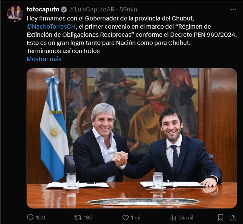 "Esto es un gran logro tanto para Nación como para Chubut. Terminamos así con todos los reclamos cruzados, tanto económicos como judiciales", celebró Caputo a través de un posteo en sus redes, donde felicitó al secretario de Hacienda, Carlos Guberman, a la subsecretaria de Coordinación Fiscal Provincial, Valeria Sánchez, y a todo el equipo del gobernador Torres.