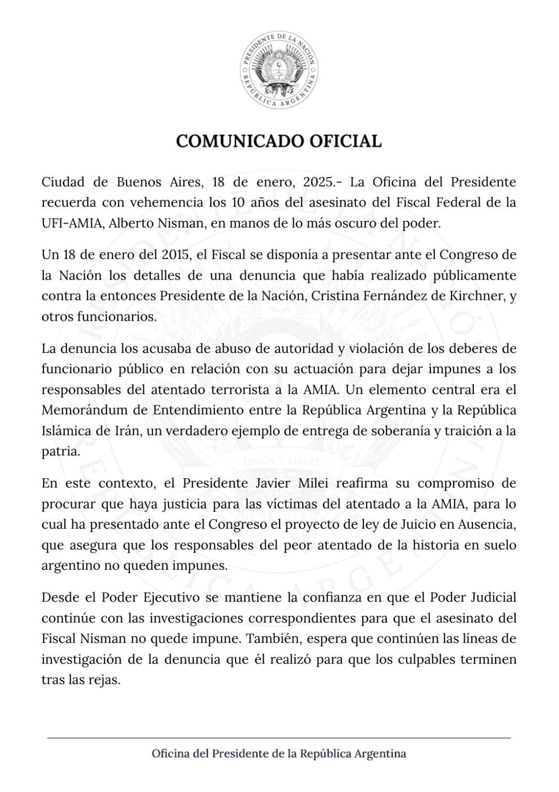 "La Oficina del Presidente recuerda con vehemencia los 10 años del asesinato del Fiscal Federal de la UFI-AMIA, Alberto Nisman, en manos de lo más oscuro del poder", afirmó el Gobierno.