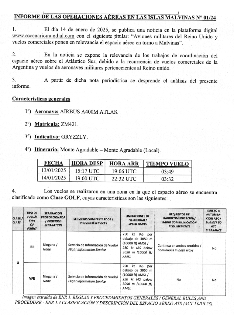 El informe girado a la Cancillería por el Comando Conjunto Aeroespacial concluye que: “Este caso del Airbus A400M Atlas que generalmente se suele emplear para operaciones en diferentes sectores alrededor de las Islas Malvinas no ha sobrevolado espacio aéreo argentino ni interrumpido norma internacional que merezca especial atención”.