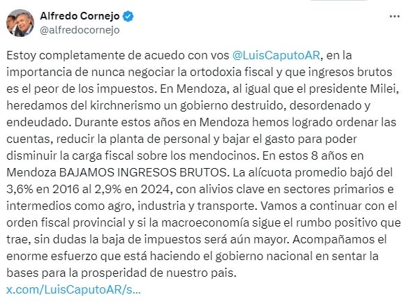 Alfredo Cornejo, sin ánimos de confrontar públicamente con Caputo, le respondió: "Estoy completamente de acuedo con vos, Luis Caputo, en la importancia de nunca negociar la ortodoxia fiscal y que ingresos brutos es el peor de los impuestos. En Mendoza, al igual que el presidente Milei, heredamos del kirchnerismo un gobierno destruido, desordenado y endeudado. Durante estos años en Mendoza hemos logrado ordenar las cuentas, reducir la planta de personal y bajar el gasto para poder disminuir la carga fiscal sobre los mendocinos.