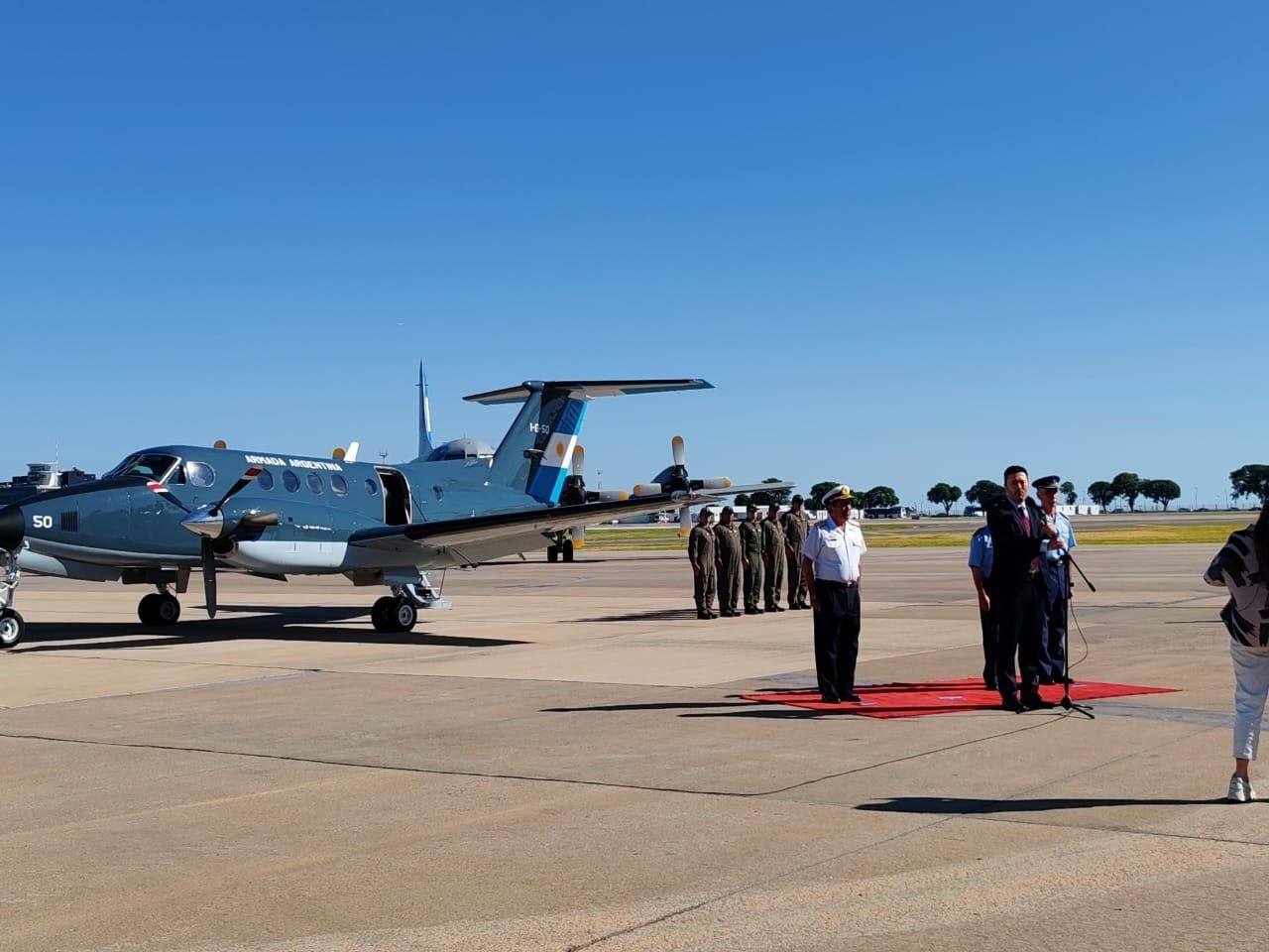 A su turno el jefe de la Armada, resaltó la capacidad que tienen las aeronaves TC-12B Hurón para operar en ambientes desafiantes y pistas no preparadas, reseñó el aterrizaje reciente del 1-G-49 en la base antártica Petrel luego de 51 años de ausencia de vuelos navales en el continente antártico.