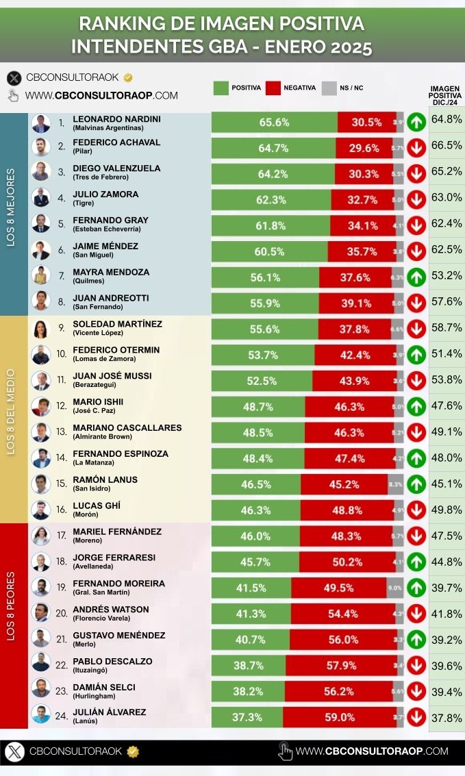 El ránking de enero que realizó la consultora indicó que los tres peores intendentes de este mes fueron los camporistas Julián Álvarez (Lanús) con un 37,3% de imagen positiva y un 59% de rechazo, y Damián Selci (Hurlingham) con un 38.2% de aceptación y un 56,2% de imagen negativa. Les sigue entre los últimos lugares el justicialista Pablo Descalzo (Ituzaingó) con un 38.7% de imagen positiva y un 57,9% de rechazo.