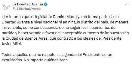 En ese sentido, el oficialismo precisó: "LLA informa que el legislador Ramiro Marra ya no forma parte de La Libertad Avanza a nivel nacional ni en ningún distrito del país, de manera irreversible, como consecuencia de no seguir los lineamientos del partido y haber votado a favor del inaceptable aumento de impuestos en la Ciudad de Buenos Aires, que contradice los ideales del presidente Javier Milei".