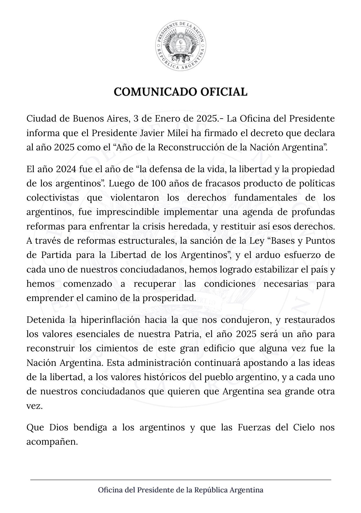 "Detenida la hiperinflación hacia la que nos condujeron, y restaurados los valores esenciales de nuestra Patria, el año 2025 será un año para reconstruir los cimientos de este gran edificio que alguna vez fue la Nación Argentina", continúa el comunicado.