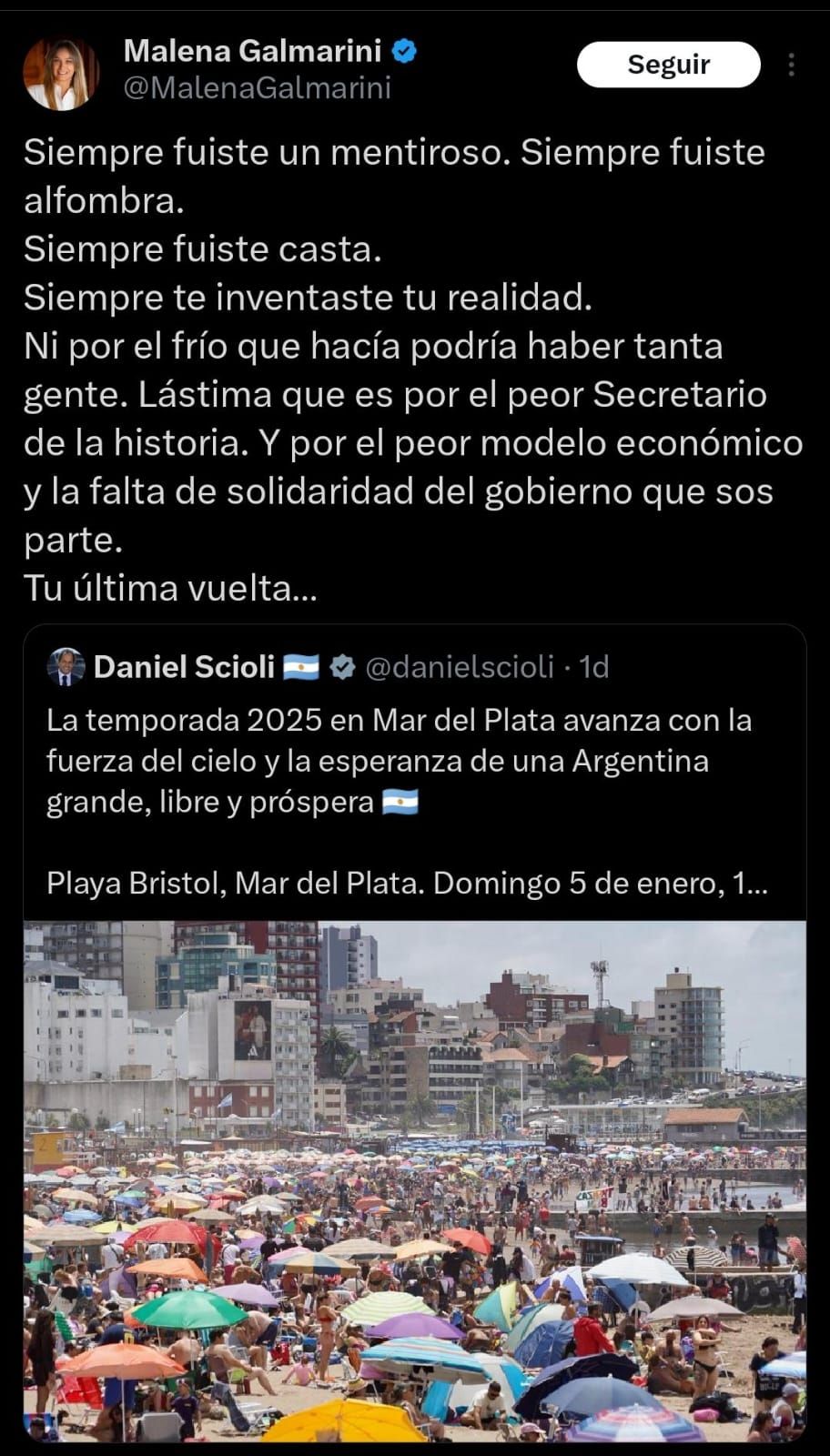 La expresidenta de Agua y Saneamientos Argentinos (AySA) y referente del Frente Renovador, Malena Galmarini, salió al cruce en sus redes sociales contra el secretario de Turismo de Javier Milei, Daniel Scioli, luego que publicara una foto de la playa Bristol de Mar del Plata llena, como muestra de una temporada exitosa. No dejó un dardo sin tirar.