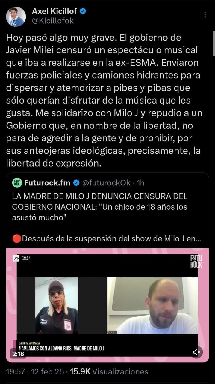 La cancelación del show de Milo J en la ex Esma por la Secretaría de Derechos Humanos desató una ola de repercusiones tanto en el ámbito del arte como de la política. Uno de los que salió a cruzar al Gobierno libertario fue el gobernador bonaerense Axel Kicillof, quien denunció "censura".