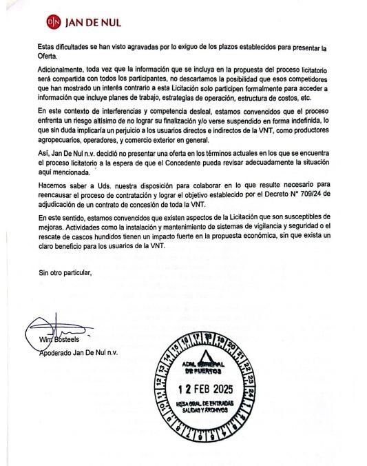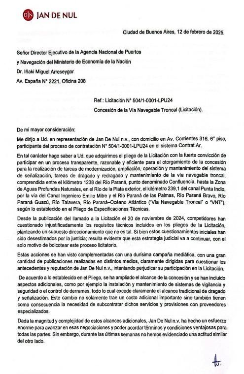 "Desde la publicación del llamado a la Licitación el 20 de noviembre de 2024, competidores han cuestionado injustificadamente los requisitos técnicos incluidos en los pliegos de la Licitación, planteando un supuesto direccionamiento que no es tal. Si bien estos cuestionamientos iniciales han sido desestimados por la justicia; resulta evidente que esta estrategia judicial va a continuar, con el solo motivo de boicotear este proceso licitatorio", advirtió Jan de Nul en su texto.