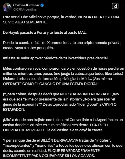 "De Hayek pasaste a Ponzi y te fuiste al pasto MAL", tituló su mensaje Cristina Fernández de Kirchner, desde el cual interpreta que Javier Milei promocionó "una criptomoneda privada, creada vaya a saber por quién", agregando que "inflaste su valor aprovechándote de tu investidura presidencial".