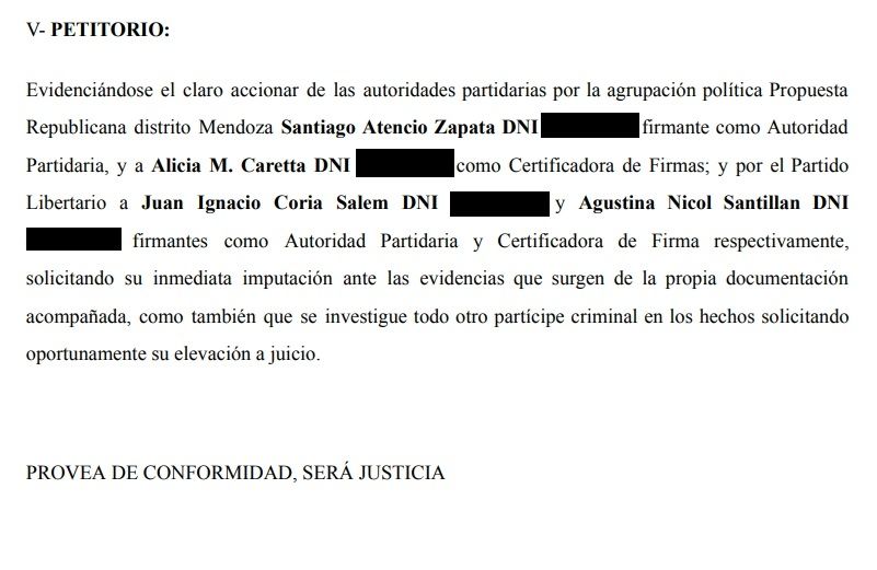 Por el lado del PRO los denunciados son Santiago Atencio Zapata, autoridad partidaria, y Alicia Caretta, certificadora de firmas. Zapata está vinculado al demarchismo ya que figura como asesor del diputado nacional Álvaro Martínez, ex presidente del PRO mendocino. En tanto, Caretta, hasta el año pasado era asesora del senador Pradines, actual titular del partido.