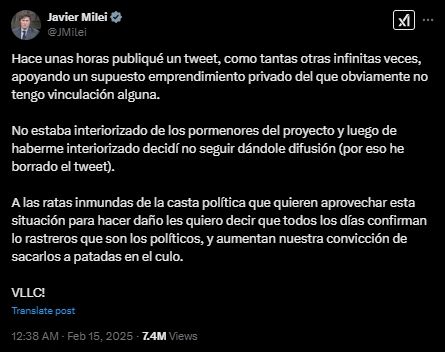 El presidente Javier Milei sorprendió el viernes al recomendar en redes sociales a una criptomoneda denominada $LIBRA, situación que generó un verdadero escándalo ya que, entre otras cosas, desde la oposición salieron a pedir juicio político contra el mandatario. Ante ese panorama, y la lluvia de críticas, el libertario publicó su descargo en su cuenta de X, donde todo había comenzado.