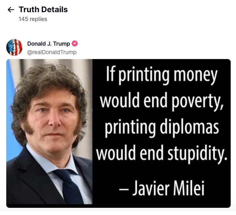A través de su cuenta de Truth Social, el líder republicano que consiguió su segundo mandato publicó este lunes una foto de su par argentino con una frase que dijo tiempo atrás: "Si imprimir dinero acabase con la pobreza, imprimir diplomas también acabaría con la estupidez".