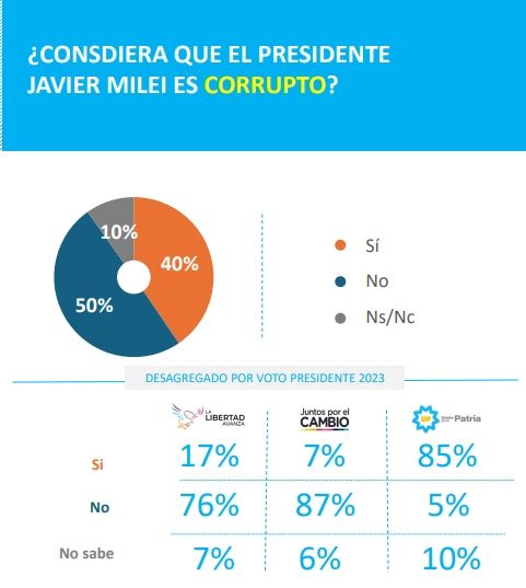 Si se disgrega ese dato, una observación llamativa es que los votantes de Juntos por el Cambio mostraron un mayor apoyo para con Milei que sus propios electores. Entre quienes se inclinaron por La Libertad Avanza, el 14% cree que el mandatario cometió un crimen y el 30% dijo no saber, mientras que entre los cambiemitas las cifras caen al 8% y al 21%, respectivamente. Por supuesto que entre los votantes de Unión por la Patria, las acusaciones contra el presidente trepan al 81%.