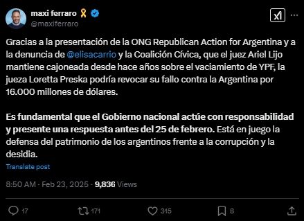 "Gracias a la presentación de la ONG Republican Action for Argentina y a la denuncia de @elisacarrio y la Coalición Cívica, que el juez Ariel Lijo mantiene cajoneada desde hace años sobre el vaciamiento de YPF, la jueza Loretta Preska podría revocar su fallo contra la Argentina por 16.000 millones de dólares", escribió el legislador.