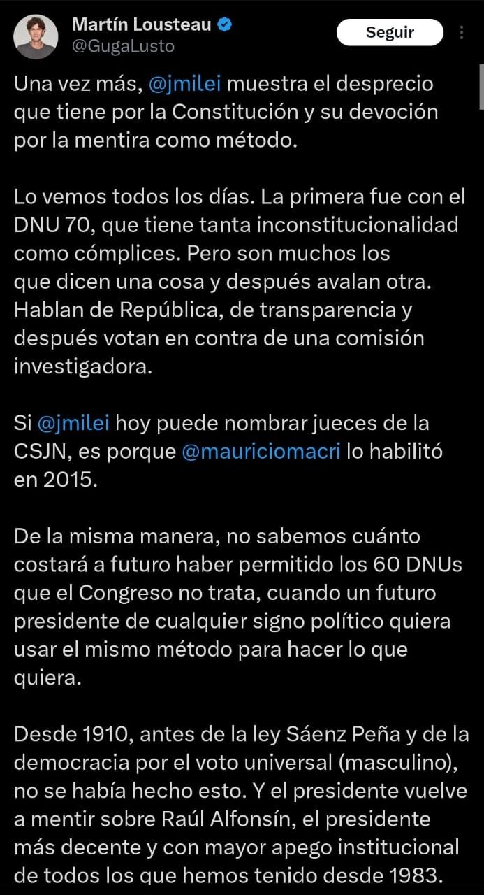 Su par boina blanca, Martín Lousteau, fue lapidario contra el presidente. “Una vez más, Milei muestra el desprecio que tiene por la Constitución y su devoción por la mentira como método”, lanzó, y agregó: “Lo vemos todos los días. La primera fue con el DNU 70, que tiene tanta inconstitucionalidad como cómplices. Pero son muchos los que dicen una cosa y después avalan otra. Hablan de República, de transparencia y después votan en contra de una comisión investigadora”.