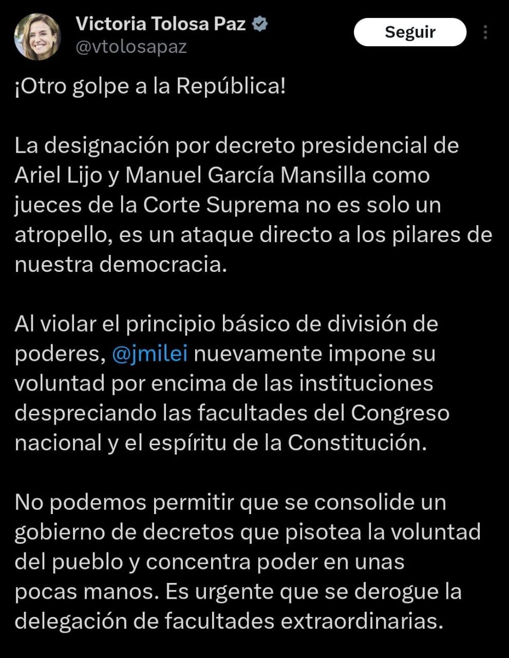 Desde el peronismo, la diputada nacional Victoria Tolosa Paz pegó el grito en el cielo: “¡Otro golpe a la República!”, exclamó. Para la dirigente, el nombramiento por decreto se trata de “un atropello” y un “ataque directo a los pilares de nuestra democracia”.