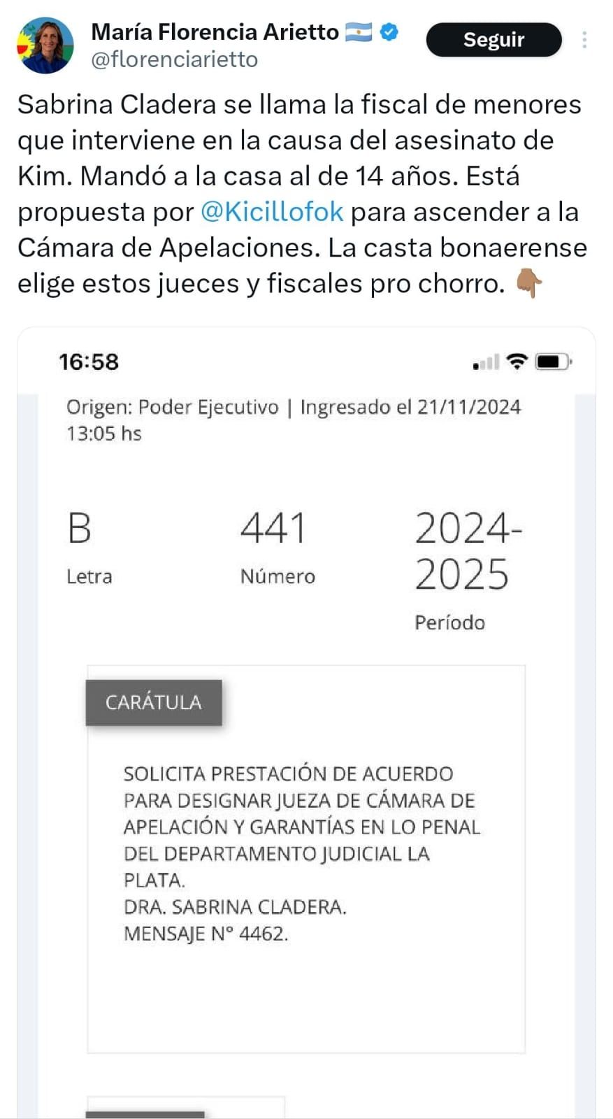 Por su parte, la senadora bonaerense María Florencia Arietto puso el foco sobre la "casta judicial" que, según sostuvo, es protegida por el Gobierno provincial. "Sabrina Cladera se llama la fiscal de menores que interviene en la causa del asesinato de Kim. Mandó a la casa al de 14 años. Está propuesta por Kicillof para ascender a la Cámara de Apelaciones. La casta bonaerense elige estos jueces y fiscales pro chorro", denunció.