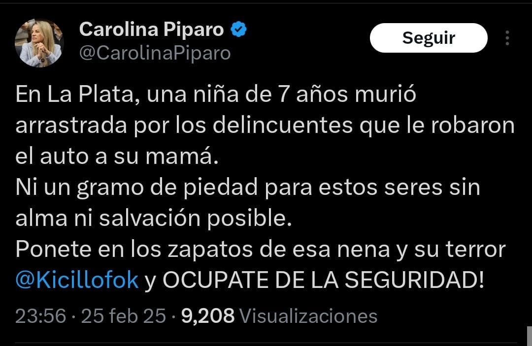 El impacto también le llegó a la diputada nacional Carolina Píparo, que, justamente, se ocupa de la agenda de la inseguridad en el rerritorio bonaerense. "En La Plata, una niña de 7 años murió arrastrada por los delincuentes que le robaron el auto a su mamá. Ni un gramo de piedad para estos seres sin alma ni salvación posible. Ponete en los zapatos de esa nena y su terror Kicillof y ocupate de la seguridad!", le exigió al gobernador.