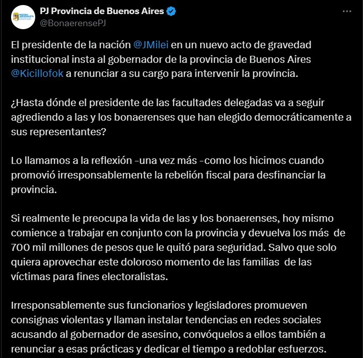 En ese sentido, el PJ Bonaerense acusó la posibilidad de que Milei "solo quiera aprovechar este doloroso momento de las familias de las víctimas para fines electoralistas" y apuntó contra los funcionarios y legisladores del oficialismo que "irresponsablemente promueven consignas violentas y llaman instalar tendencias en redes sociales acusando al gobernador de asesino". "Convóquelos a ellos también a renunciar a esas prácticas y dedicar el tiempo a redoblar esfuerzos", concluye el texto.