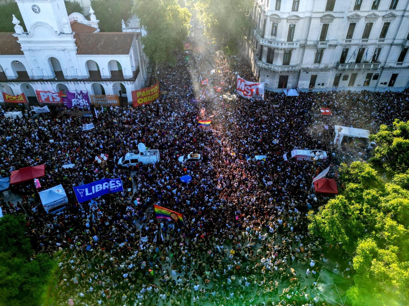 Acompañado por diferentes dirigentes políticos, organizaciones sociales y sindicales, la comunidad LGBTQ+ se movilizó en la Ciudad de Buenos Aires y en distintos puntos del país contra el discurso del jefe de estado libertario en el Foro Económico Mundial, donde entre otras cosas manifestó: "Quiero ser claro que cuando digo abusos no es un eufemismo, porque en sus versiones más extremas la ideología de género constituye lisa y llanamente abuso infantil. Son pedófilos".