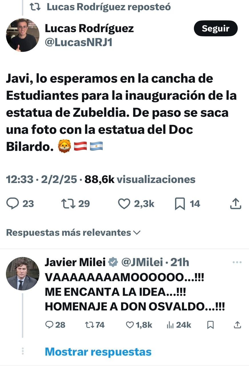 La propuesta al Presidente fue este domingo, luego de que el hincha, aprovechando que Javier Milei había comentado una publicación en X sobre que arquero era de su preferencia: "El Pato" Fillol o "El Loco" Gatti. Desde su cuenta @LucasNRJ1 escribió: "Javi, lo esperamos en la cancha de Estudiantes para la inauguración de la estatua de Zubeldía. De paso, se saca una foto con la estatua del doc Bilardo". Recibiendo cinco minutos después la respuesta de Milei a su posteo aceptando el convite : "¡Vamoooooo! Me encanta la idea. Homenaje a Don Osvaldo".