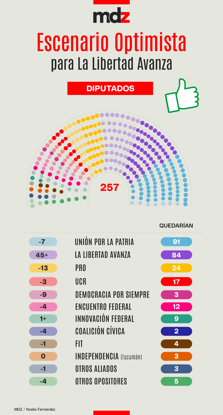 MDZ realizó dos escenarios extremos para analizar un posible reparto de bancas. Uno optimista para La Libertad Avanza, obteniendo triunfos por casi todo el país (excepto casos muy difíciles como Santiago del Estero, por ejemplo), y otro pesimista, con un contexto económico que no lo beneficie y termine decepcionando.