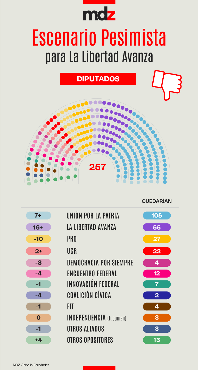 Incluso en el segundo de los escenarios, LLA terminaría aumentando su bloque, a unos 55 diputados. Pero sería un muy mal resultado ya que quedaría lejos del quórum y habiendo perdido la elección de medio término. Esa perspectiva sería muy peligrosa para la segunda mitad del gobierno de Milei, con un Congreso mucho más hostil.