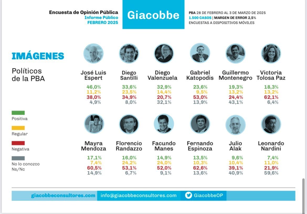 Por su parte, entre los políticos bonaerenses que más destacan, están: José Luis Espert (46%), Diego Santilli (33,6%), en tercer lugar Diego Valenzuela (32,9%), Gabriel Katopodis (23,6%), Guillermo Montenegro (19,3%) y Victoria Tolosa Paz (18,3%).