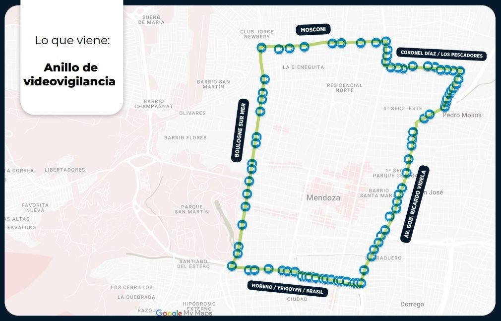 Las nuevas cámaras blindarán toda el área urbana de la Ciudad de Mendoza y planean ubicarse sobre la Avenida Boulogne Sur Mer al Oeste; Mosconi, Coronel Díaz y Los Pescadores al Norte, la Avenida Gobernador Ricardo Videla o Costanera al Este y la calles Moreno, Yrigoyen y Brasil al Sur.