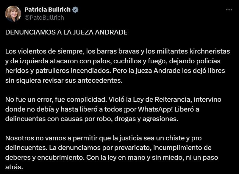 "Los violentos de siempre, los barras bravas y los militantes kirchneristas y de izquierda atacaron con palos, cuchillos y fuego, dejando policías heridos y patrulleros incendiados. Pero la jueza Andrade los dejó libres sin siquiera revisar sus antecedentes", acusó Patricia Bullrich a través de un posteo en X.