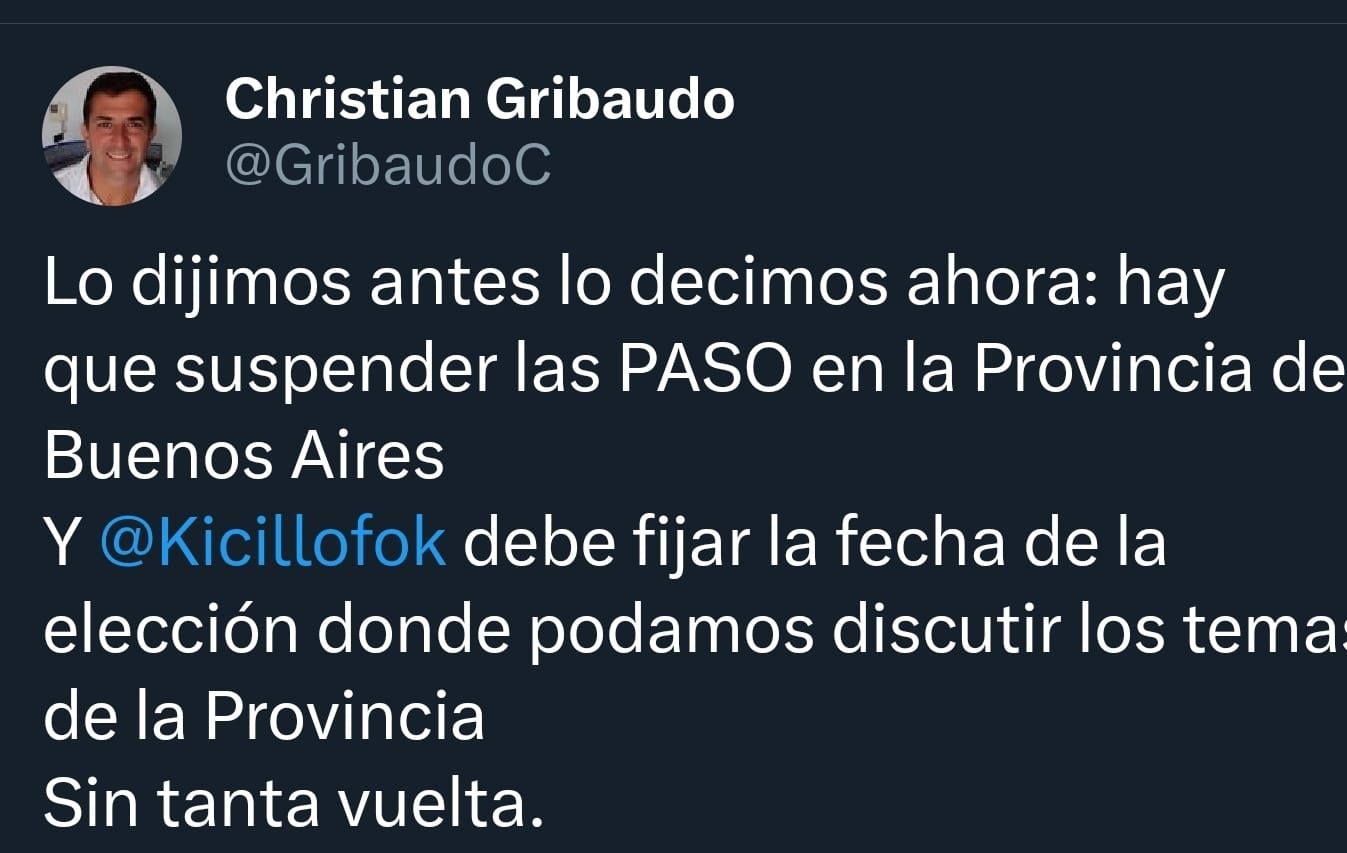 Por su parte Christian Gribaudo, presidente del bloque de Senadores PRO en la Legislatura bonaerense, exigió la suspensión de las Primarias. “Lo dijimos antes lo decimos ahora, hay que suspender las PASO en la Provincia de Buenos Aires”. En este contexto le pidió al gobernador que "sin tanta vuelta” fije la fecha de la elección.