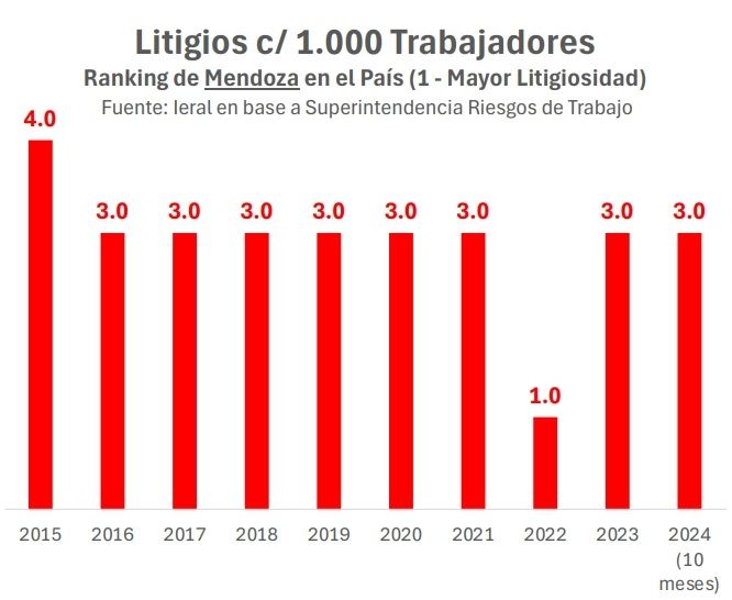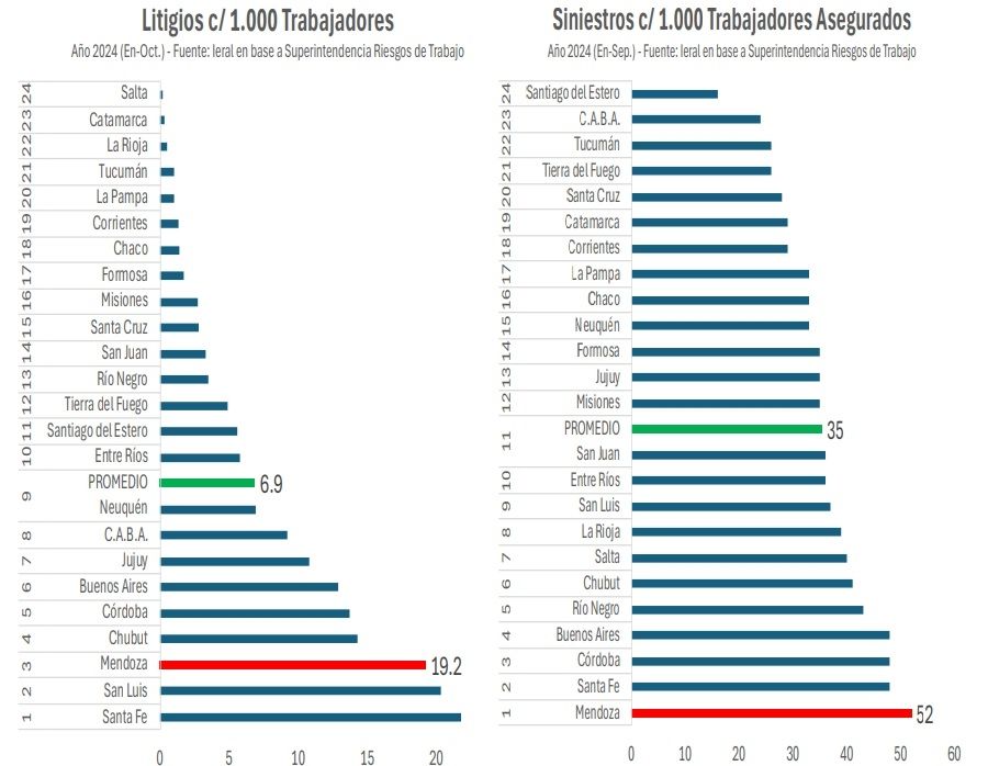 A partir de la información disponible a 2024, el estudio remarca que Mendoza es una de las provincias con mayor litigiosidad (por trabajador) en ART con 19,2 litigios cada 1000 trabajadores, solo superada por las provincias de Santa Fe y San Luis.