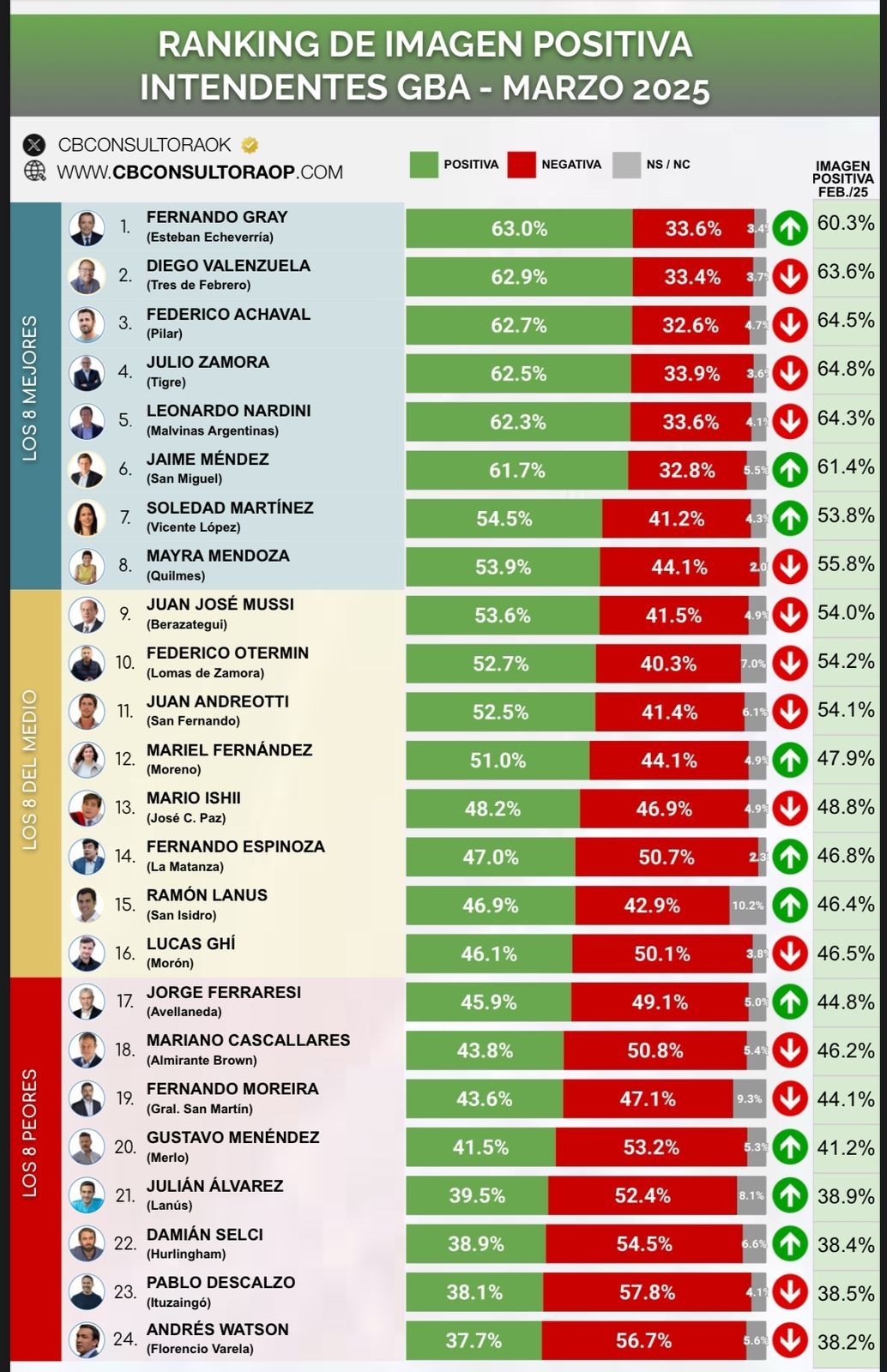Una reciente encuesta realizada por CB Consultora sondeó la imagen positiva de los intendentes de la provincia de Buenos Aires, durante el mes de marzo. Fernando Gray, de Esteban Echeverría, encabezó el podio con 63% de los votos, mientras que Andrés Watson, de Florencio Varela, nuevamente quedó último con el 37,7%.