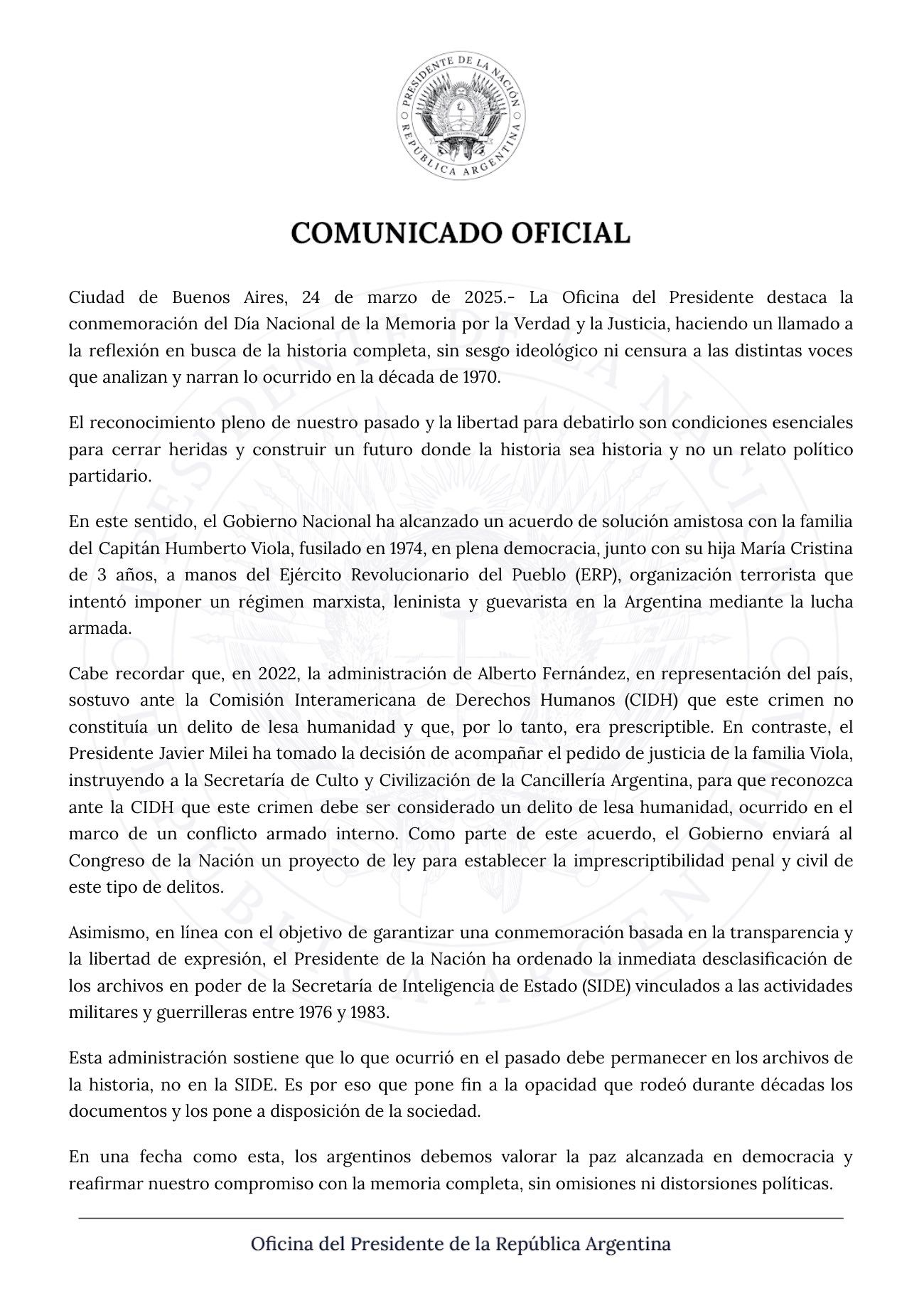 "Para el gobierno del presidente Milei, el asesinato del capitán Viola y su familia constituyó un crimen de lesa humanidad", concluyó Adorni, y finalizó: "Este 24 de marzo y todos los días es necesario tener una memoria completa de la historia de nuestro país y de nuestras fuerzas armadas".